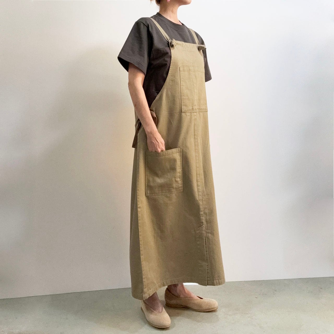 定番エプロンであるUTILITY APRONのデザインをアレンジし、ジャンパースカートとしてもアプロンとしても活躍するアイテムにしています