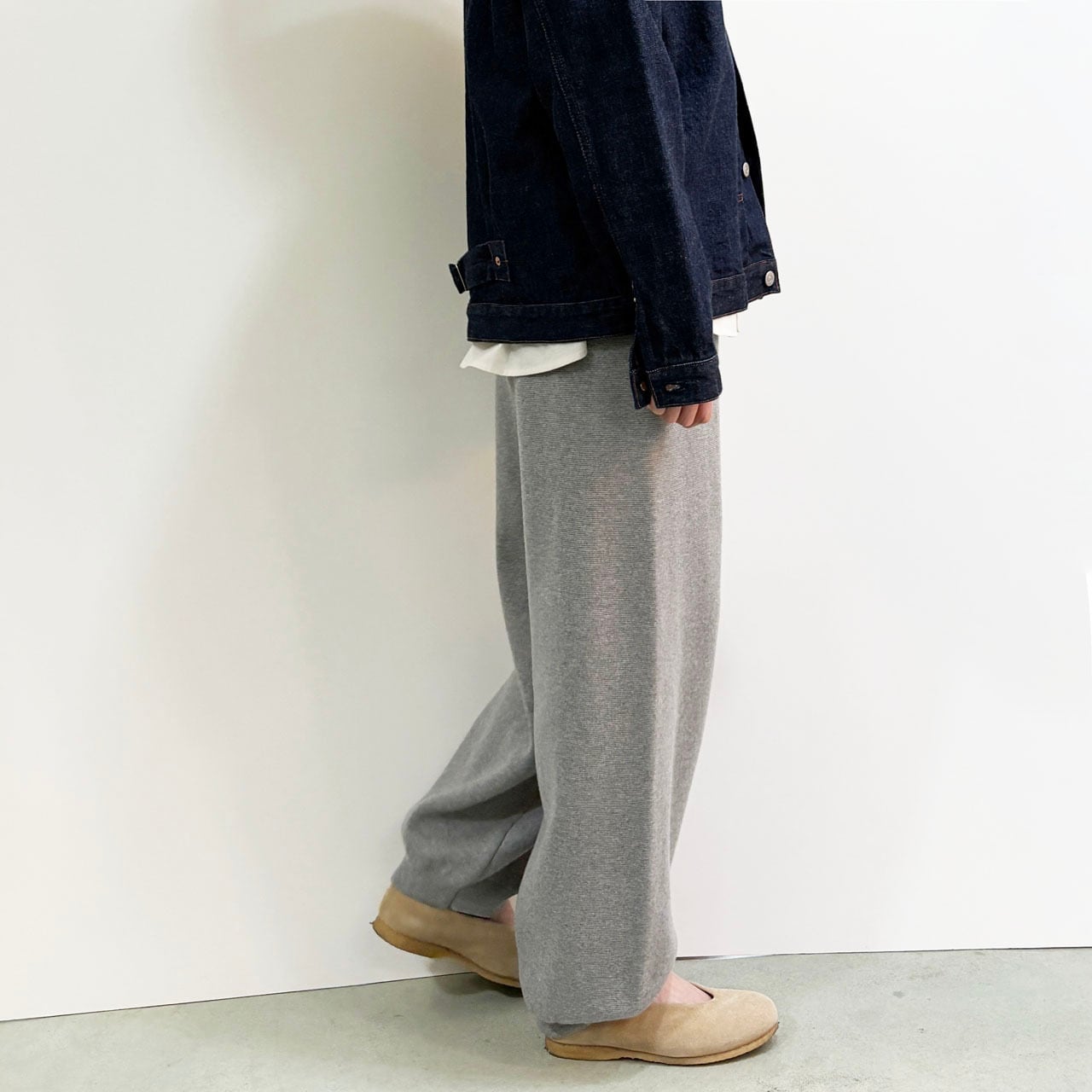 体のラインを拾いにくいセミワイドシルエットで、裾にはさりげなくリブを効かせているため合わせる靴を選ばず幅広い着こなしが可能