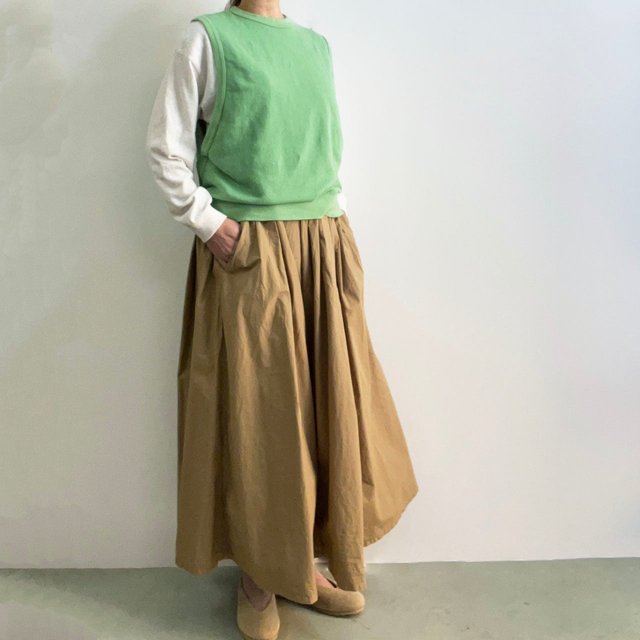 春はベストとしてTシャツに重ね着でき