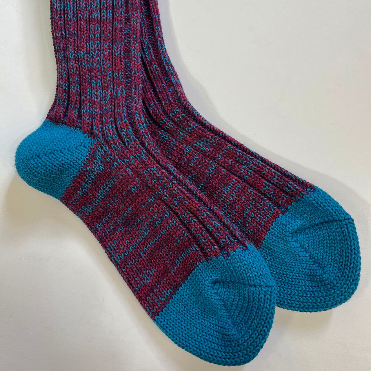 DECKAの定番である Heavyweight Socks を、異なる色の糸を引き揃えて編むことでマルチカラーに作り替えています