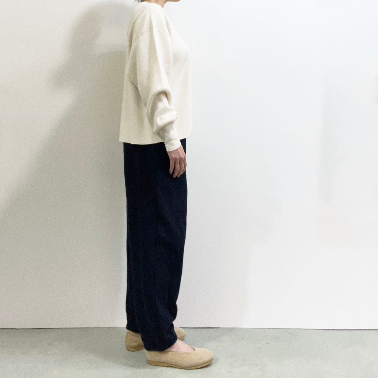 そのスウェット地を縦使いと横使いで切り替えた独特なシルエットのパンツ